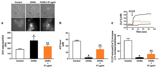 Effects of Ce-SANP on mitochondrial function (e.g., ROS production, ATP levels, mitochondrial Ca2+ homeostasis). (a) Arbitrary units of fluorescence in NGF-differentiated PC12 cells incubated with DCFH-DA under control conditions, after chemical hypoxia + reoxygenation alone and chemical hypoxia + reoxygenation in the presence of Ce-SANP (57 µg/mL). Ce-SANP were added only during the reoxygenation phase. On the top of the panel, representative images for each treatment were reported. The bars show mean values ± SEM from three different experimental sessions. * p ≤ 0.05 vs. control; ** p ≤ 0.01 vs. CH/Rx. (b) basal ATP content (in µM) in differentiated PC12 cells under control conditions, after chemical hypoxia + reoxygenation alone and chemical hypoxia + reoxygenation in the presence of Ce-SANP (57 µg/mL). Ce-SANP were added only during the reoxygenation phase. The bars show mean values ± SEM from three different experimental sessions. * p ≤ 0.05 vs. control; ** p ≤ 0.01 vs. CH/Rx. (c) FCCP-induced [Ca2+]i increase in NGF-differentiated PC12 cells under control conditions, after chemical hypoxia + reoxygenation alone and chemical hypoxia + reoxygenation in the presence of Ce-SANP (57 µg/mL). Ce-SANP were added only during the reoxygenation phase. On the top of the panel, representative traces for the effects of each treatment on [Ca2+]i are reported.