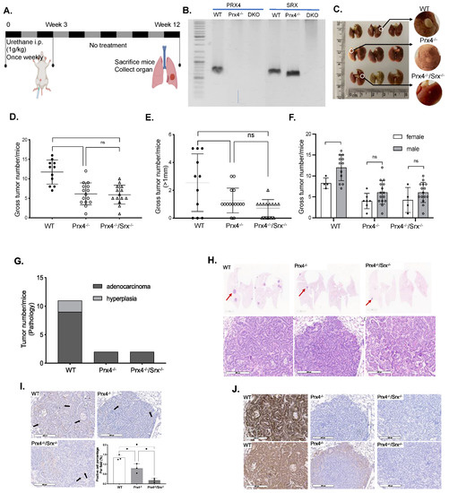 Figure 1. Loss of Prx4 or Srx/Prx4 suppresses tumor formation and cell proliferation in the urethane-induced lung adenocarcinoma mouse model. (A) Schematic illustration of the methodology for 12-week urethane-induced lung tumorigenesis in mice. (B) Genotype verification. (C) Lung gross images with zoom-in of tumors on the surface. (D) Comparing the average tumor number of each mouse with three genotypes (>0.2 mm). (E) Comparing the average tumor number of each mouse with three genotypes (>1 mm). (F) Comparing the average tumor number of each mouse with gender difference for the three genotypes (>0.2 mm). (G) Pathologic diagnosis of tumors for the three genotypes based on H&E histology. (H) H&E staining of lung tumors microscopic image for the three genotypes. Arrows identify examples of tumor. (I) Anti-Ki67 staining of tumor tissue from three genotypes and quantitative analysis of staining intensity. Arrows identify Ki-67 positively stained cells (brown). (J) Anti-Prx4 (upper) and -Srx (lower) staining of tumor tissue from three genotypes. (*, p < 0.05; ns, p > 0.05).
