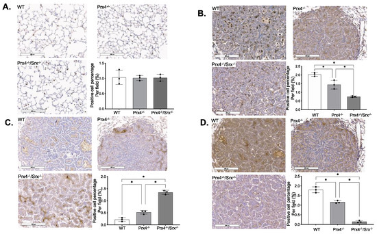 The causal connection between ROS, inflammation, immunity, and cancer is increasingly acknowledged. Recent evidence has bolstered the notion that inflammation is a crucial aspect of tumor growth [44]. It is becoming increasingly apparent that the tumor microenvironment, which is predominantly regulated by inflammatory cells, is a crucial component of the neoplastic process, promoting proliferation, survival, and migration. Previous work has shown that mice treated with urethane have an elevated number of immune cells [45]. These findings suggest that increased lung inflammation is directly linked to the formation and progression of urethane-induced lung cancer. We wondered whether there was a difference in inflammatory cell infiltration among wild-type, Prx4−/−, and Prx4−/−/Srx−/− mice tumors. F4/80 is a cell surface glycoprotein and has been widely used as a marker for mouse macrophages [46]. Firstly, we examined the staining of F4/80 positive cells in lungs of age-matched, naïve mice (without exposure to any treatment) from different genotypes. In general, there was an average of one F4/80+ cell with characteristic morphology of mature macrophage per alveoli, and there was no difference in staining intensity, pattern, or distribution (Figure 2A). However, F4/80 positive macrophages were abundantly found in urethane-induced lung tumors, and the overall number of macrophages in tumors from either Prx4−/− or Prx4−/−/Srx−/− mice was significantly less than in that of tumors from wild-type mice. Compared with tumors from Prx4−/− mice, the number of F4/80+ cells in tumors from Prx4−/−/Srx−/− mice was also significantly lower (Figure 2B). To further characterize these cells, staining for CD86 as a marker of M1 macrophages and CD163 as a marker of M2 macrophages were used. We found that macrophages in either Prx4−/− or Srx−/−Prx4−/− mice were mainly M1 type, whereas tumors from wild-type mice were enriched with M2 type (Figure 2C,D). These data indicate that the disruption of the Srx-Prx4 axis is associated with significant changes in intratumoral macrophage infiltration and their polarization, which may contribute to the reduction of tumor multiplicity and bulk observed in Prx4−/− and Srx−/−Prx4−/− mice.
