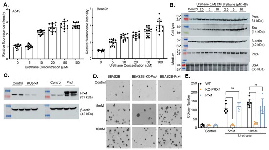 Figure 3. Urethane induces ROS level and cell transformation through increased Srx expression and Prx4 secretion in normal lung epithelial cells. (A) ROS levels change with urethane treatment in normal and cancer cell lines. (B) Change of intracellular Srx and Prx4 levels and secreted Prx4 with urethane treatment. (C) Confirmation of establishment of knockdown/overexpress Prx4 cell line (D,E) Change of cell transformation with urethane treatment. (ns, p ≥ 0.05).