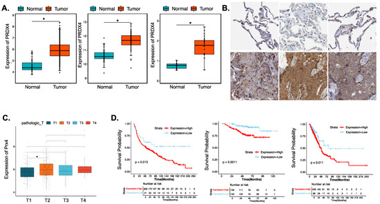 Figure 4. Prx4 is upregulated in lung adenocarcinoma, and negatively related to prognosis. (A) The expression level of PRDX4 in LUAD and normal tissues from TCGA-LUAD, GSE19804, and GSE27262 datasets. (B) Example results of anti-Prx4 staining of normal (upper) and tumor (lower) tissue from six patient samples obtained from Human Protein Atlas. (C)The expression level of Prx4 in different stages of LUAD. (D) Impact of PRDX4 expression on overall survival in LUAD patients. (*, p < 0.05).
