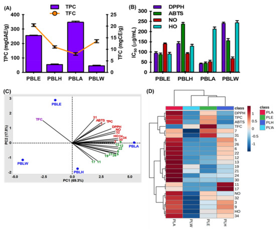 Only 18 of the 36 chemicals (cut-off value of 1% was present in each sample) were chosen before chemometric analysis (Table 1). Finally, 24 relevant variables for PCA, including 18 chemicals and 6 antioxidant characteristics, were chosen. A principal component analysis (PCA) statistical technique enables the direct modeling of various sample datasets and a better understanding of their relationships. Therefore, the interdependence of variables (chemical compositions and biological impacts) was analyzed in this study, using PCA to pinpoint the most distinctive variables within the datasets. It overviews the correlations between the variables and their capacity to distinguish between the four ex-tracts (PBLE, PBLH, PBLA, and PBLW). The PBL extract datasets produced two principal components (PCs). The variance was explained by PC1 (69.3%) and PC2 (17.8%), with a combined percentage of total variations of 87.1%. Biplots were used to display the PCA results (Figure 1C). As shown in Figure 1C, compounds 3, 7, 24, 30-32, 36, TPC, DPPH, ABTS, NO, and the HO-radical scavenging activity contributed positively to both PC1 and PC2. TFC had a positive contribution to PC2 while compounds 5, 6, 9, 11-13, 17, 19, 21, 22, and 26 had positive contributions to PC1 but negative contributions to PC2.