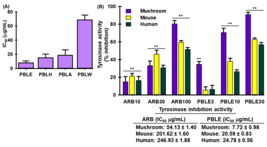 Tyrosinase inhibitory effects of PBL extract/fractions. (A) Effect of PBL extract/fractions on mushroom tyrosinase. (B) The inhibitory effect of PBLE on mushroom tyrosinase, mice, and human cellular tyrosinase. Mean ± SD (n = 3). ** p < 0.05 vs. non-treated (NT) control. PBLE: ethanolic extract of PBL; PBLH: hexane fraction of PBL; PBLA: ethyl acetate fraction of PBL; PBLW: aqueous fraction of PBL; and ARB: arbutin.