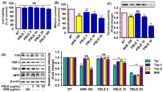 The depigmenting effects of PBLE on MNT-1 cells. Effect of PBLE on (A) cell viability, (B) melanin production, (C) Tyrosinase (Tyr) inhibition activity measured by zymography, (D) proteins involved in melanogenesis, including microphthalmia-associated transcription factor (MITF), Tyr, tyrosinase-related protein-1 (Trp-1), and -2 (Trp-2), as determined by Western blotting. Densitometric analysis of relative protein expression matching to Figure 3D. Mean ± SD (n = 3). ** p < 0.05 vs. non-treated (NT) control. NS: non-significant compared to NT. ARB: arbutin.