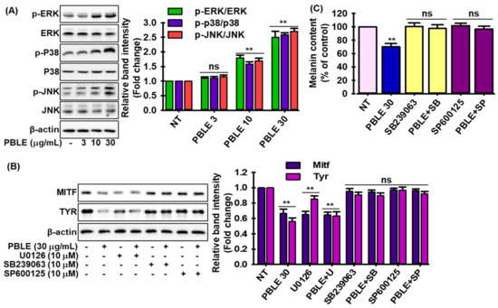 The effect of PBLE on mitogen-activated protein kinase (MAPK) phosphorylation in MNT-1 cells. (A) Effects of PBLE concentration on the activation of MAPK proteins. (B) Effects of various MAPK protein inhibitors on the expression of MITF and Tyr, with or without PBLE. Densitometric analysis of relative protein expression are presented in adjacent figure (C) Effects of different MAPK protein inhibitors on melanin production, with or without PBLE. Mean ± SD (n = 3). ** p < 0.05 against the untreated (NT) control. NS: non-significant compared to equivalent inhibitor alone. U0126: extracellular signal-regulated protein kinases (ERKs) inhibitor; SB239063: p38 inhibitor; and SP600125: c-jun N-terminal kinases (JNKs) inhibitor.
