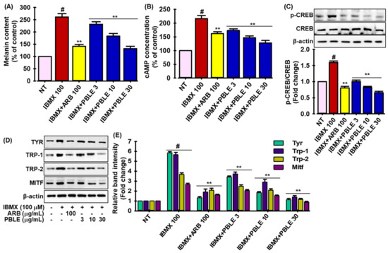 The depigmenting impact of PBLE on isobutylmethylxanthine (IBMX)-induced MNT-1 cells. (A) PBLE prevents the overproduction of melanin caused by IBMX. (B) The effect of PBLE on IBMX-induced cellular cyclic adenosine monophosphate (cAMP) production. (C) PBLE inhibits IBMX-stimulated causes cAMP response to element-binding protein (CREB) protein phosphorylation. Densitometric analysis of relative protein expression are presented in adjacent figure. (D) Effect of PBLE on proteins associated in melanogenesis, such as MITF, Tyr, Trp-1, and Trp-2, in IBMX-stimulated cells, as measured by Western blotting. (E) Densitometric analysis of relative protein expression, as depicted in Figure 5D. Mean ± SD (n = 3). # p < 0.05 vs. non-treated (NT) control. ** p < 0.05 vs. IBMX-treated control. ARB: arbutin.