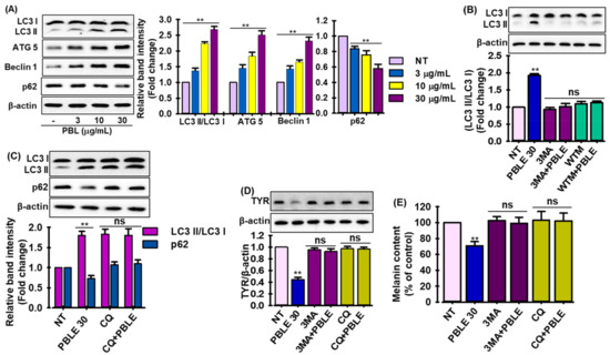 The effect of PBLE on the activation of autophagy in MNT-1 cells. (A) Effect of PBLE on proteins associated with autophagy, such as microtubule-associated protein-light chain 3 (LC3), Atg5, Beclin 1, and p62, in MNT-1 cells, as measured by Western blotting. (B) Effects of autophagy inhibitors on the expression of LC3, with or without PBLE. (C) Effects of autophagosome fusion with lysosome inhibitor on the expression of LC3 and p62, with or without PBLE. (D) Effects of autophagy inhibitors on the expression of Tyr, with or without PBLE. (E) Effects of autophagy inhibitors on the melanin production, with or without PBLE. Mean ± SD (n = 3). ** p < 0.05 against the untreated (NT) control. NS: non-significant compared to equivalent inhibitor alone. 3MA: 3-Methyladenine (autophagy inhibitor), WTM: wortmannin, (PI3K inhibitor), and CQ: chloroquine (autophagosome fusion inhibitor).