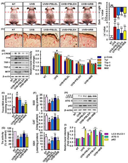 Furthermore, UVB-induced oxidative stress (OS) boosts the melanogenesis and antioxidant defense systems and plays a pivotal role in maintaining an optimal redox balance, protecting against OS, excessive melanogenesis, and photo-damaged skin [34]. Thus, to scrutinize whether PBLE boosts the antioxidant defense systems in UVB-induced pigmented mice, malondialdehyde (MDA; lipid peroxidation marker), and various antioxidant enzymes, such as superoxide dismutase (SOD), catalase (CAT), glutathione (GSH) and thioredoxin (Trx), activities were measured. As shown in Figure 7E, UVB treatment significantly boosted the MDA level (2-fold) than the non-treated control. In contrast, PBLE treatment dose-dependently mitigated the MDA level in a significant manner, and at higher doses of PBLE, demonstrated greater lipid peroxidation inhibition than ARB. In addition, the levels of SOD, CAT, GSH, and Trx were significantly downregulated by UVB irradiation, while PBLE treatment reversed this trend in a dose-dependent manner (Figure 7F,G). Interestingly, higher doses of PBLE, as opposed to ARB, strongly augmented endogenous antioxidant enzymes (Figure 7F,G). Moreover, to confirm the autophagic activation by PBLE in UVB-induced pigmenting mice, expressions of autophagic markers including LC3, Atg5, and p62 were evaluated by immunoblotting assay. As described in Figure 7H,I, PBLE treatment augmented the expression of LC3 and Atg5, and suppressed the UVB-induced overexpression of p62, confirming that PBLE also activated the autophagy in vivo. It is noteworthy that PBLEH has greater potential for autophagic activation than ARB.
