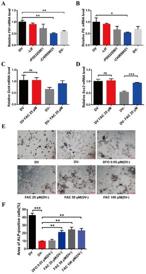 To further examine the relationship between CHIR99021, iron, and cell stemness in mESCs, we supplemented normal embryonic stem cell medium and embryonic stem cell differentiation medium, in which LIF, PD0325901, and CHIR99021 were simultaneously removed, with 25 µM ferric ammonium citrate (FAC) and examined the mRNA levels of the pluripotency genes, Oct4 and Sox2. Supplementing the embryonic stem cell culture medium with iron did not affect the expression of these mRNAs. However, the levels of Sox2 mRNA were significantly increased after supplementing the differentiation medium with 25 µM FAC (Figure 1C,D). By alkaline phosphatase staining, we also found that the stemness was weakened in mESCs cultured with differentiation medium, with the cells exhibiting a differentiated, spreading morphology. After supplementing the differentiation medium with 25 μM, 50 μM, or 100 μM FAC, although the mESCs also appeared to differentiate, the color of the cells was darker than that of the DV- group (Figure 1E,F). Together, these results suggested that removal of CHIR99021 decreases iron levels and the stemness of mESCs; supplementation with iron may be beneficial to the maintenance of stemness.