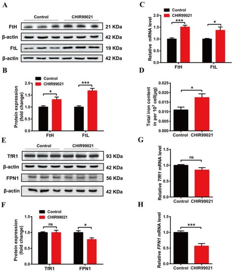 In order to further explore the effects of CHIR99021 on iron metabolism, we treated Neuro-2a cells with CHIR99021 and assessed the expression of iron metabolism related proteins, including FtH, FtL, TfR1, FPN1, and DMT1 (+/-IRE) (divalent metal transporter 1). The protein levels of FtH and FtL increased significantly in CHIR99021-treated Neuro-2a cells (Figure 2A,B). The levels of FtH and FtL mRNA were consistent with the increased protein levels (Figure 2C). As ferritin is the main intracellular iron storage protein, we next investigated whether total intracellular iron levels were changed by ICP-MS; total intracellular iron levels increased significantly after CHIR99021 treatment (Figure 2D). We also evaluated the levels of TfR1 protein and mRNA and found no significant differences (Figure 2E–G). However, the protein and mRNA levels of FPN1 [28] decreased significantly (Figure 2E,F,H). Additionally, the protein level of DMT1 decreased significantly (Figure S2). These results indicated that iron metabolism has been affected, and iron export decreased, which is expected to increase the amount of uncommitted iron in cells and, in turn, stimulate an increase in ferritin expression.