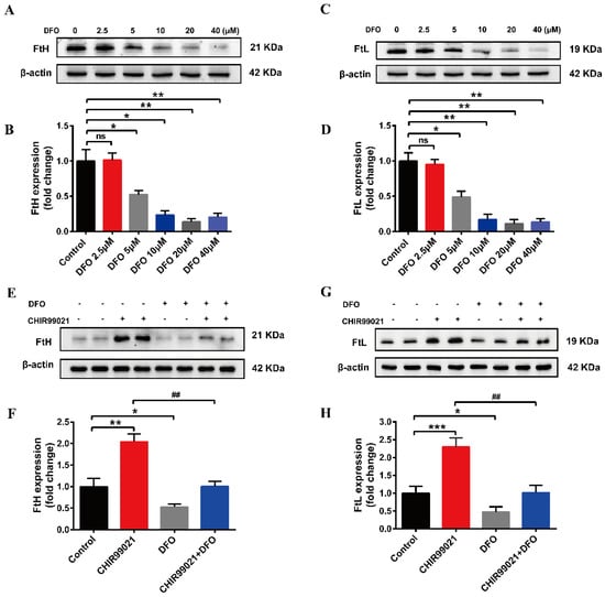 DFO prevents the increase of ferritin expression induced by CHIR99021. (A–D) Western blot analysis of FtH and FtL protein after treatment with the indicated concentrations of DFO. (E,F) Western blot analysis of FtH levels after treatment with or without CHIR99021 and/or DFO. (G,H) Western blot analysis of FtL levels after treatment with or without CHIR99021 and/or DFO. The relative expression levels are normalized to β-actin. The data are expressed as the mean ± SEM. * p < 0.05, ** p < 0.01, *** p < 0.001, ## p < 0.01, ns, not significant.