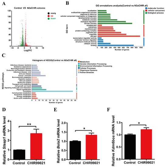Comparison of RNA-seq results and verification of the differentially expressed genes between control and CHIR99021-treated cells. (A) Volcano plot of mRNA expression differences. (B) GO enrichment analysis between control and CHIR99021-treated Neuro-2a cells. (C) Statistical classification analysis of KEGG pathways between control and CHIR99021-treated Neuro-2a cells. (D–F) qRT-PCR analysis of Steap1 (D), Bola2 (E) and Kdm6bos (F) mRNA levels with or without CHIR99021 treatment. The mRNA levels are normalized to β-actin mRNA levels and then expressed as the fold of control group. The data are expressed as the mean ± SEM. * p < 0.05, ** p < 0.01.