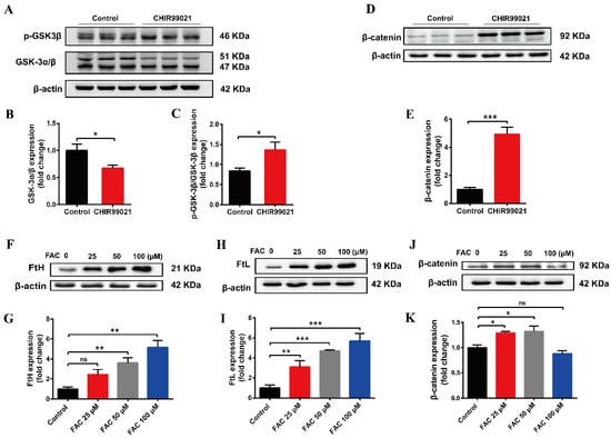 The small molecular compound, CHIR99021, is a highly effective inhibitor of GSK-3 α/β, while β-catenin is a downstream target gene of GSK-3β in the classical Wnt pathway [34]. To verify the effect of CHIR99021 on the Wnt/GSK-3β/β-catenin pathway, we examined the related proteins. We found that CHIR99021 significantly downregulated the expression of GSK-3α/β, concomitantly upregulating the levels of p-GSK3β and β-catenin (Figure 5A,B,D,E). Thus, the ratio of p-GSK3β/GSK-3β increased significantly with the treatment of CHIR99021 (Figure 5C). In addition, we found that 25 µM and 50 µM FAC significantly increased the expression of β-catenin (Figure 5F–K). In consideration of these and the previous results, we hypothesized that there may be a relationship between β-catenin and iron level, particularly on the context of CHIR99021 exposure.