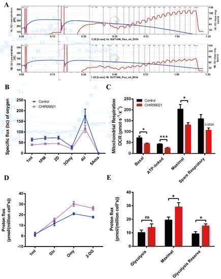 CHIR99021 treatment decreases mitochondrial oxidative phosphorylation and enhances glycolytic capacity in Neuro-2a cells. (A) Overall oxygen consumption capacity of cells, as measured by O2k. Top panel, control group; bottom panel, CHIR99021-treated group. (B) Oxygen flux of cells after adding the indicated reagents. (C) Basal respiration, ATP-linked respiration, maximal respiration and spare respiratory capacity, as indicated by oxygen consumption rate (OCR) in Neuro-2a cells treated as shown. (D) Proton flux of cells after adding the indicated reagents. (E) Basal glycolysis, maximal glycolytic capacity and glycolysis reserve capacity in cells treated as shown. The data are expressed as the mean ± SEM. * p < 0.05, *** p < 0.001, ns, not significant.
