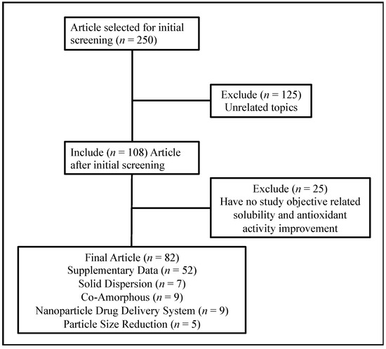 This study was conducted based on the literature obtained from the Scopus, PubMed, and Google Scholar databases since 2018, using the keywords “antioxidant” and “solubility improvement”. Opinions, reviews, and unrelated topics were excluded, and the databases were limited to obtaining the specific topic of pharmaceutical formulations related to water solubility improvement strategies on antioxidant compounds. A flow chart of the methodology is shown in Figure 1.