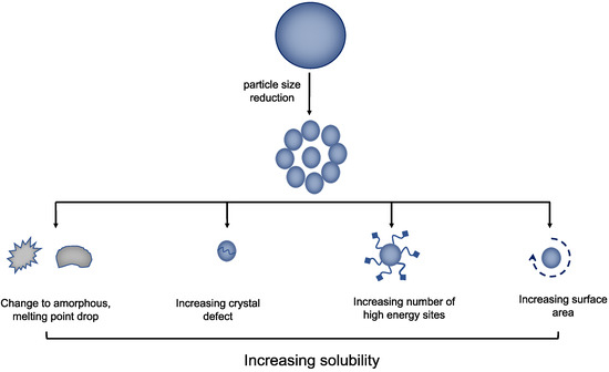 Particle size reduction is a common approach used in medication manufacturing or API development in order to address the psychochemical properties issue of poorly water-soluble drugs [45]. However, the disadvantages are the prolonged manufacturing time and the requirement for micronization at an early stage of the production process. Particle size reduction is often separated into two categories, namely, bottom-up and top-down. Bottom-up refers to a process where a substance is first changed into a molecular state using an appropriate solvent and slowly recrystallized by transforming from a molecular state into particulate crystals [46]. Meanwhile, the top-down technique, which is more common, entails lowering the particle size through the milling process or other appropriate operations. To obtain the best results during particle size reduction, top-down and bottom-up approaches are frequently combined [47]. This method aims to improve the solubility by decreasing the particle size and increasing the surface area. Since large surfaces allow for greater contact between the particles and the solvent medium, they will become more wettable quickly and dissolve the active ingredient faster [48]. Alshora et al. (2016) reported that the increased solubility of a poorly water-soluble drug by particle size is caused by several factors, as shown in Figure 4. Firstly, reducing the particle size can raise the surface-to-volume ratio, leading to an increase in the particle surface exposed to the solvent and improving the solubilizing activity by increasing the solvent contact area. Secondly, the small size can increase the number of high-energy sites, which creates more opportunities for the solid particle to interact with the solvent. Thirdly, the method also produces crystal defects, leading to the easy removal of molecules from weak particles. Finally, the smaller particle size reduces its melting point, which results in fewer intramolecular interactions of the drugs and a higher solubility [49].