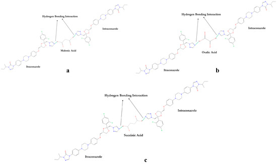Hypothetic trimers can be formed from co-crystal of ITZ and dicarboxylic acids with various carbon chain lengths, (a) ITZ-Malonic Acid, (b) ITZ-Oxalic Acid, and (c) ITZ-SCU. Adapted from data presented originally in Ref. [59].