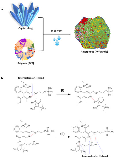 The schematic illustration of (a) hydrophilic and hydrophobic sides of the amlodipine besylate. (b) System of amorphous solid dispersion. Formation mechanism of drug–drug (I) and drug–polymer (II) intramolecular and intermolecular hydrogen bonding, respectively. H bonds are shown as red lines. Adapted from data presented originally in Ref. [70].