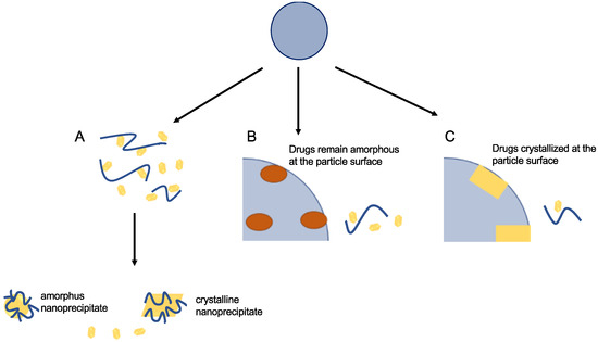 Three possible scenarios of drug dispersion from solid dispersions. (A) Particles rapidly dissolve and release the drug into a highly supersaturated solution; (B) drug and polymer are gradually released; and (C) drug and polymer are gradually released but the drug is present in a crystals state. Adapted from data presented originally in Ref. [74].