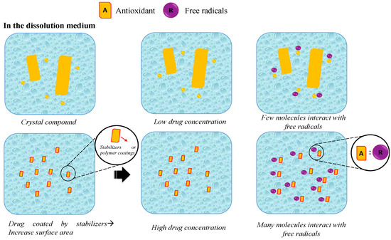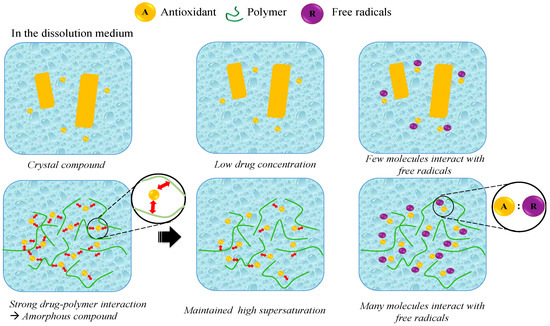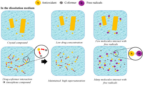 However, some physicochemical limitations related to solubility can influence the bioavailability and effectivity of antioxidants [3]. The aqueous solubility of a drug for an oral formulation is very important, because it has a strong influence on the drug’s bioavailability. The drug molecules could be absorbed after dissolving in gastrointestinal fluid [4,5,6]. Therefore, developing a strategy to increase the solubility of a drug is necessary for the formulation of a poorly water-soluble drug, especially for oral antioxidant drug formulations [7,8].