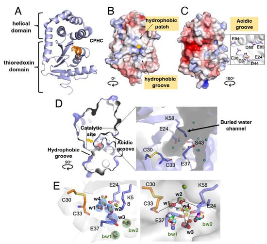 Considering the observed conservation of an acidic groove in the non-catalytic side of DsbA proteins, we carried out a detailed inspection of this area in EcDsbA (PDB: 1FVK). This revealed that three residues, E24, E37 and the positively charged K58 located close to the catalytic site (<13 Å) (Figure 1D), coordinate a network of water molecules (Figure 1D). Our analysis also revealed that this buried water channel connects the thiol group of the buried C33 in the catalytic C30-X-X-C33 motif with the bulk solvent (Figure 1D).