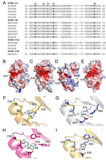 Although DsbA proteins share a high structural similarity, their amino acid sequence conservation is low [15,38]. They have been classified into four phylogenetic subgroups, Ia, Ib, IIa and IIb [39]. To assess the prevalence of the charged residues neighbouring the catalytic site, we carried out a sequence alignment of members of DsbA that have been structurally and biochemically characterised [39]. Specifically, we selected 15 DsbA proteins and used T-coffee Expresso, which allowed a structure-based sequence alignment [40] (Figure 2). Sequence comparison showed that E24 (E. coli DsbA numbering) is strictly conserved in class Ia and Ib DsbAs, with more variation observed in DsbA-II. Similarly, E37 is also highly conserved in class Ia and Ib DsbAs, with some of the latter having an aspartic acid residue. The limited set of Class II DsbA sequences shows slightly more variability in this position, which can be a glutamic acid, other charged residues such as aspartic acid and histidine or polar residues such as asparagine. K58 is also highly conserved in class I DsbA, with some having the lysine substituted with a positively charged arginine or threonine. Overall, the negatively charged groove present on the non-catalytic face of DsbA seems to be a conserved feature of most DsbAs (Figure 2B–E). We also analysed in detail the divergent DsbA structures and uncovered that all DsbA structures possessed a buried pocket behind the active site, with the w1 water molecule being strictly conserved (Figure 2F–I). The proximity of the charged residues and coordinated water molecules to the active site and their conservation across diverse DsbA proteins led us to hypothesise that they may have a functional role.