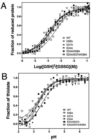 We next assessed whether the mutations introduced in the charged residues neighbouring the EcDsbA redox centre affected the redox properties of EcDsbA. With a reduction potential of −122 mV, EcDsbA is one of the strongest thiol oxidants reported to date [43]. We determined the redox potential of all generated mutants by measuring their equilibrium constants (Keq) with glutathione using a value of −240 mV for the standard potential of the GSH/GSSH redox pair [44]. Under our experimental conditions, the positive control EcDsbA yielded a E0’ of −125 ± 1 mV, similar to the previously reported value (−122 mV) [43]. All single mutants, E24A, E37A and K58A, and the double mutant E24A/E37A, displayed almost identical redox potential to the wildtype (Figure 3A, Table 1). Conversely, introduction of the three mutations, E24A/E37A/K58A, resulted in a less oxidising redox potential of −139 ± 1 mV, 14 mV lower than that of wildtype.