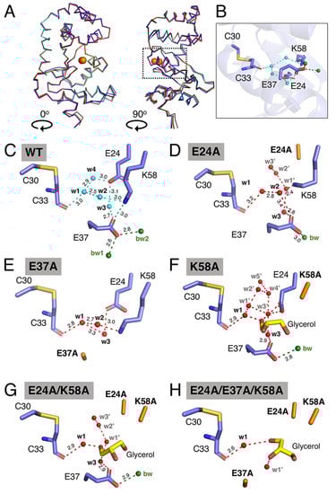 To further investigate the charged residues and the connective water network they form, we evaluated the impact of alanine mutations of the residues E24, E37 and K58 on the protein structure and water connectivity by X-ray crystallography. Crystal structures of all five mutants (E24A, E37A, K58A, E24A/K58A, E24A/E37A/K58A) were solved at resolutions ranging between 1.47 and 2.3 Å. DsbA K58A and double-mutant E24A/K58A were crystalised in space group C2, with two molecules per asymmetric unit. The other three mutants, E37A, E24A and E24A/E37A/K58A, were crystallised in space groups P21, P212121 and P2, respectively, with four molecules per asymmetric unit. All structures were refined to crystallographic Rfree values of 0.1838–0.2588 (Supplementary Table S2). Despite the different crystallisation conditions and space groups, all mutants adopted similar three-dimensional folds (Figure 4A). Overlay of chain A of wildtype DsbA (PDB: 1FVK) and chain A of E24A/E37A/K58A revealed the largest structural variation among all mutants, with an RMSD of 0.53 Å over 174 Cα atoms. In comparison, overlay of chain A of wildtype DsbA and chain A of the E24A/K58A mutant showed the smallest difference, with an RMSD of 0.34 Å over 174 Cα atoms (Supplementary Table S3).
