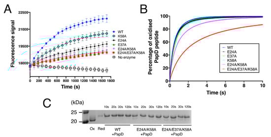 Earlier studies showed that mutations introduced in residues adjacent to the active site can slow the resolution of the covalent mixed-disulphide intermediate formed between DsbA and substrates [52]. To investigate whether the mutants generated in this work affected the release of the substrate, we mixed DsbA mutants and PapD-derived peptide at a 1:1.1 molar ratio and quenched the reaction with trichloroacetic acid (TCA) at different time points (10 s, 20 s, 30 s and 120 s). To differentiate oxidised DsbA, reduced DsbA and the DsbA-peptide intermediate in the SDS-PAGE analysis, the sample was treated with thiol alkylating agent 4-acetamido−4’-maleimidylstilbene−2,2’-disulfonic acid (AMS, ~500 Da). Oxidised DsbA does not have free thiols, so it cannot be alkylated and remains unmodified. Alkylation by AMS of reduced DsbA (two free thiols) resulted in a ~1 kDa shift in mass relative to oxidised DsbA. Alkylation of the DsbA-peptide intermediate resulted in a ~1.5 kDa shift relative to oxidised DsbA. As shown in Figure 5C, no bands corresponding to the intermediate complex were observed for the wildtype, the double E24A/K58A or the triple E24A/E37A/K58A mutant samples collected at different time points. This demonstrated that the mutations generated in this work did not seem to slow the resolution of the mixed-disulphide intermediate. However, at the 10 s and 20 s time points, the double and triple mutants contained more oxidised DsbA relative to the wildtype, indicating that the DsbA-mediated oxidation process was less efficient, in line with the observation from the kinetic studies.