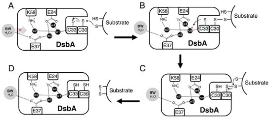 A notable observation of this work was that although the introduced alanine mutations did not significantly change the redox properties of DsbA, some mutations considerably altered DsbA oxidase activity (only the triple mutant displayed a more reducing redox potential). To understand the molecular basis for this apparent discrepancy, we considered the DsbA-dependent disulphide formation process. Mechanistically, this reaction is thought to occur in two steps [57,58,59], whereby first a substrate cysteine in the thiolate form attacks the sulphur atom of the N-terminal cysteine of the oxidised CXXC active site (C30 in EcDsbA), resulting in the formation of an intermediate disulphide-bonded DsbA-substrate complex (Figure 6). For the reaction to proceed in the forward direction and avoid futile redox cycles, the DsbA C-terminal cysteine (C33 in EcDsbA) must be stabilised [55], probably by protonation, allowing another deprotonated cysteine from the substrate to resolve the intermediate complex, which then results in the release of the oxidised substrate and reduced DsbA (Figure 6).