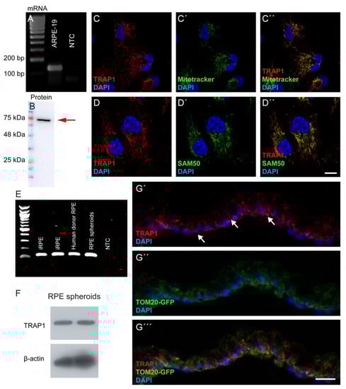 The expression of TRAP1 mRNA in ARPE-19 cells was confirmed by PCR analysis using specific primers (Figure 1A), while TRAP1 protein was also detected in these cells (Figure 1B–D). Furthermore, we showed that TRAP1 protein is located in the mitochondrial compartment since its expression co-localized with MitoTracker (Figure 1C), a dye that accumulates specifically in mitochondria [], and with SAM50 (Figure 1D), a mitochondrial protein. We further confirmed the presence of TRAP1 mRNA in the human RPE cells using samples from human induced pluripotent stem cells (hiPSCs)-derived RPE (iRPE), RPE isolated from hiPSC-derived retinal organoids (RPE spheroids) and human donor RPE (Figure 1E). Similar to the results obtained with ARPE-19 cells, TRAP1 protein was also detected at the basal side in RPE spheroids (Figure 1F,G), where it co-localizes with TOM20, a mitochondrial marker (Figure 1G). This result is in accordance with previous electron microscopy studies on RPE spheroids in which mitochondria were localized at the basal side [].