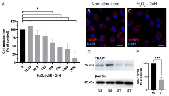 TRAP1 levels decrease upon challenge with hydrogen peroxide. ARPE-19 cells were treated with different doses of H2O2 (0; 31.25; 62.5; 125; 125; 250; 500; 1000 and 2000 μM) for 24 h (A). The dose of 500 μM was selected for the following experiments. ARPE-19 cells were treated, or not, with 500 μM H2O2 for 24 h (B–E). Scale bars in (B,C): 20 µm. Exposure to 500 μM H2O2 for 24 h resulted in lower levels of TRAP1. NS: Non-stimulated (black bars); ST: stimulated with H2O2 (grey bars). The values are presented as a percentage of the control (non-treated cells). Cell metabolism was assessed using the resazurin assay. Four independent experiments were performed (n = 4). For the graph (A), statistical significance was calculated by using the Mann–Whitney U test. For the graph (E), statistical significance was calculated by using an unpaired t-test. Statistically significant values: * p < 0.05, *** p < 0.001. In the graphs, all values are expressed as mean ± standard error of the mean (SEM).