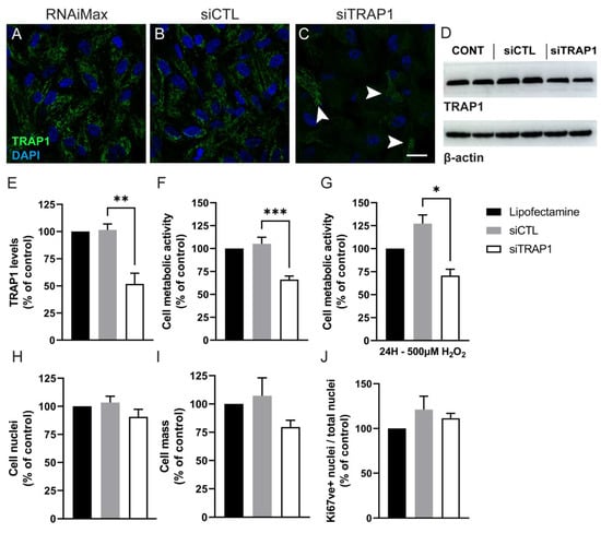 We wondered if TRAP1 silencing affects cell metabolism (measured as dehydrogenase activity), production of reactive oxygen species (ROS), proliferation and survival of RPE cells. The levels of TRAP1 were reduced by approximately 50% at 72 h upon silencing TRAP1 expression using specific siRNAs (siTRAP1) (Figure 3A,C–E) []. In contrast, the transfection of a control scramble RNA (siCTL), used as a control, did not affect TRAP1 levels (Figure 3A,B,D,E). Seventy-two hours after TRAP1 silencing, we detected a decrease of 33.8% in cell metabolic activity as measured by the resazurin assay (Figure 3F). Moreover, TRAP1 silencing did not exacerbate the decrease in cell metabolic activity in ARPE-19 cells exposed to 500 μM of H2O2 for 24 h (Figure 3G). The total number of cell nuclei (Figure 3H), cell mass (measured by Sulforhodamine B (SRB) assay (Figure 3I)), and the number of proliferating cells (measured by the number of Ki67-positive cells (Figure 3J)) remained similar to the control (siCTL). The data suggest that TRAP1 silencing promotes a decrease in cell metabolic activity in live cells, rather than an increase in cell death or a reduction in proliferation.