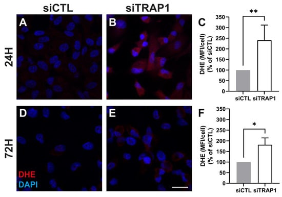 TRAP1 silencing in ARPE-19 cells increase the levels of superoxide anion. Representative confocal microscopy images of fluorescent detection of ROS by dihydroethidium (DHE) in cells transfected with siCTL (A,D) and siTRAP1 (B,E) for 24 h (A,B) and 72 h (D,E). Scale bars: 20 µm. Mean fluorescence intensity (MFI) of at least 4 images per condition/experiment was measured using Image J v1.53C and divided by the number of the DAPI-positive nuclei (MFI/cell) (C,F). Four independent experiments were performed (n = 4). Statistical significance was calculated by using the Mann––Whitney U test. Statistically significant values: * p < 0.05, ** p < 0.01. In the graphs, all values are expressed as mean ± standard error of the mean (SEM).
