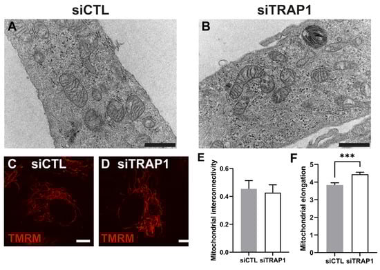 TRAP1 silencing increases mitochondrial elongation without affecting mitochondrial ultrastructure. Transmission electron microscopy (TEM) images of mitochondria from ARPE-19 cells transfected with siCTL (A) or siTRAP1 (B). Representative mitochondria are presented. Scale bars in A and B: 100 nm. Analysis of confocal microscopy images obtained using Image-iT™ TMRM Reagent (TMRM) for mitochondrial labelling in ARPE-19 cells transfected with siCTL (C) or siTRAP1 (D). Scale bars in C and D: 50 µm. The mitochondrial interconnectivity was similar between the two experimental groups (E). siTRAP1 cells showed increased mitochondrial elongation (F). Statistical significance was calculated by using an unpaired t-test. Statistically significant values: *** p < 0.001. In the graphs, all values are expressed as mean ± standard error of the mean (SEM).