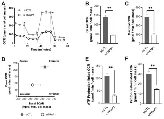 We have characterized the outcome of TRAP1 silencing on mitochondrial physiology. We started by assessing the impact on the mitochondrial ultrastructure by transmission electron microscopy (TEM). TRAP1 silencing in ARPE-19 cells had no major effect on the mitochondrial ultrastructure, in which clear cristae and membranes were observed (Figure 5A,B). To complement the ultrastructural analysis, mitochondria were stained with Image-iT™ TMRM Reagent (TMRM), and morphological parameters such as mitochondrial interconnectivity and elongation were quantitated []. No fragmentation of mitochondria was observed in siTRAP1 cells compared with the control (Figure 5C,D). Moreover, silencing of TRAP1 did not affect the mitochondrial interconnectivity (Figure 5E) but increased mitochondrial elongation (Figure 5F) compared with siCTL cells. The effects of TRAP1 silencing on ARPE-19 cells mitochondrial oxygen consumption rates (OCR) and extracellular acidification rate (ECAR) were also evaluated (Figure 6A). TRAP1 silencing significantly reduced the basal (40.1%) and maximal (42.8%) OCR (Figure 6 B,C) as well as the ATP production-linked (36.2%) and proton leak-related (14.6%) OCR (Figure 6E,F). Furthermore, the decrease in mitochondrial OCR was paralleled by a slight decrease in basal extracellular acidification rate (ECAR) (Figure 6D). Measurement of the two major energy-producing pathways of the cell, mitochondrial respiration (measured as the OCR) and glycolysis (indirectly measured as the ECAR) can reveal the four bioenergetic phenotypes that a cell can display: (a) quiescent; (b) energetic; (c) aerobic; and (d) glycolytic. Interestingly, by plotting the average data of basal OCR (Figure 6B) against basal ECAR (Figure 6D), we observed that TRAP1 silencing shifted the cell’s metabolic profile towards a more quiescent phenotype compared with untreated cells (Figure 6B,D).