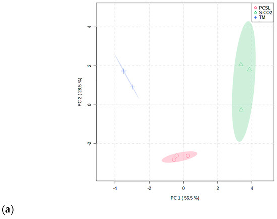 Scores plot (a) and loadings bi-plot (PC-1 vs. PC-2) (b) of P. ferulacea extracts’ phytochemical profile. Abbreviations are as follows: TM, traditional maceration; PCSL, pressurized cyclic solid–liquid extraction, S-CO2: supercritical CO2 extraction.