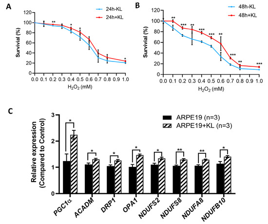 KL protein protects RPE from oxidative stress and upregulates the expression of genes related to mitochondrial activity. Cell viability assays of ARPE19 treated with increasing concentrations of H2O2 for 24 h (A) or 48 h (B) with or without 10 nM recombinant KL protein. Addition of KL for 48 h significantly increased the cell viability of ARPE19 at all H2O2 concentrations compared to control (without KL). The mean ± SD and the p-values were calculated for statistical significance. Holm–Sidak t-test was performed using GraphPad Prism 8.3.0. * p ≤ 0.05, ** p ≤ 0.01, *** p ≤ 0.001. (C) qPCR analyses of ARPE19 incubated with recombinant KL for 48 h revealed an increase in the expression of PGC1α (related to mitochondrial biogenesis, regulation of antioxidant genes and energy metabolism), ACADM (downstream target of PGC-1α, required by the initial step of fatty acid beta-oxidation), DRP1 and OPA1 (associated with mitochondrial fission and fusion), and respiratory chain complex I subunits (NDUFS2, NDUFS8, NDUFA8, NDUFB10), as compared to control. Graph represents mean ± SEM of three independent experiments. Holm–Sidak t-test was performed using GraphPad Prism 8.3.0. * p ≤ 0.05, ** p ≤ 0.01.