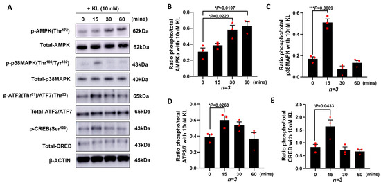 To investigate the mechanisms by which KL regulates the expression of PGC-1α and the downstream genes, we cultured ARPE19 without serum in the presence of 10 nM of KL protein for different time points (0, 15, 30, and 60 min). The cells were lysed followed by protein extractions and Western blot analyses for various proteins. As shown in Figure 2A, the KL protein was able to induce the phosphorylation of AMPK at Thr172, p38 MAPK at Thr180/Tyr182, ATF2/ATF7 at Thr71/Thr53, and CREB at Ser133, compared to the untreated control cells (0 time point). The densitometry analysis of three independent Western blots showed a significant increase in pAMPK at 30 and 60 min of the KL treatment compared to the untreated cells (Figure 2B), as well as an increase in p-p38MAPK (Figure 2C), p-ATF2/7 (Figure 2D), and p-CREB (Figure 2E) at 15 min of the KL treatment as compared to the untreated control cells. AMPK can phosphorylate and activate CREB [57], which in turn activates the CRE sequence of the PGC-1α promoter [58]. In addition, p38MAPK phosphorylates ATF2, which in turn can activate the same CRE site, inducing the transcriptional activation of PGC-1α, as shown in Figure 1C.