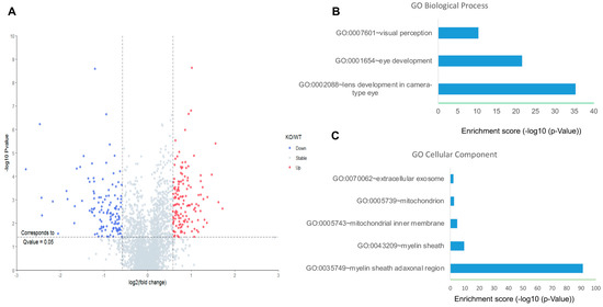 Proteomic analyses of the RPE/retina of WT and Kl-/- mice. (A) The volcano plot for the retina proteome in WT and Kl-/- mice. Blue color dots show down-regulated proteins, and red dots represent up-regulated proteins in Kl-/- compared to the WT retina; GO cellular component (B) and biological process (C) of down-regulated retina proteins in the RPE/retina of WT and Kl-/- mice (n = 5).