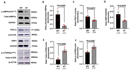 Based on our in vitro observations, we further investigated the regulatory role of KL on the AMPK and PGC-1α pathway in vivo. We analyzed the phosphorylated levels of AMPK at Thr172 that are required for AMPK activation in the RPE/retina of the Kl-/- and WT mice. Our data showed reduced p-AMPK (Thr172), suggesting an inactive AMPK in the RPE/retina of Kl-/- compared to that of the WT mice (Figure 4A,B). We further tested the levels of PGC-1α protein and observed a decrease in its protein expression in the RPE/retina of Kl-/- as compared to that of the WT mice (Figure 4A,C). An analysis of the DRP1 protein, the mitochondrial fission regulator, showed a decrease in the DRP1 protein levels in the RPE/retina of Kl-/- as compared to those of the WT mice (Figure 4A,D). Because mTOR inhibits AMPK and studies have shown that increased mTOR activity can induce degeneration in the RPE [59], we measured the mTOR and p-mTOR protein levels in the RPE/retina of Kl-/- compared to WT mice. Our data showed an increase in total mTOR and p-mTOR protein levels in the RPE/retina of Kl-/- compared to WT mice, suggesting an overactive mTOR in Kl-/- mice (Figure 4A,E,F).