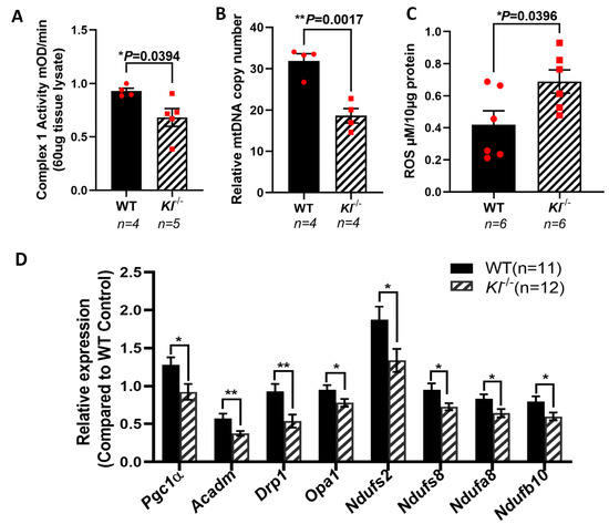 KL is shown to regulate oxidative stress by activating FoxO forkhead transcription factors and the inhibition of IGF-1 [60]. PGC-1α plays a crucial role in sustaining the mitochondrial antioxidant defense [61] and upregulates the expression of ROS detoxifying enzymes [62,63]. To further explore the effects of KL on mitochondria, we measured the activity of the respiratory chain Complex I, and found that its activity is reduced in the RPE/retina of the Kl-/- as compared to that of WT mice (Figure 5A). To determine the effect of KL deficiency on mitochondrial function, we measured the mtDNA copy numbers in the RPE/retina of the Kl-/- and WT mice, and found significantly reduced mtDNA in the RPE/retina of the Kl-/- mice as compared to that of the WT mice (Figure 5B). These observations support the regulatory role of KL in mitochondrial health and function. We also evaluated the ROS levels in the RPE/retina of the Kl-/- mice as compared to that of the WT mice. Our data revealed increased levels of ROS in the RPE/retina of the Kl-/- mice as compared to those of the WT mice (Figure 5C). qPCR analyses of mitochondrial-associated genes revealed a significant decrease in their expression in the RPE/retina of the Kl-/- mice as compared to that of the WT mice (Figure 5D), further supporting our in vitro observations in Figure 1C and our total proteomic data in Figure 3C.
