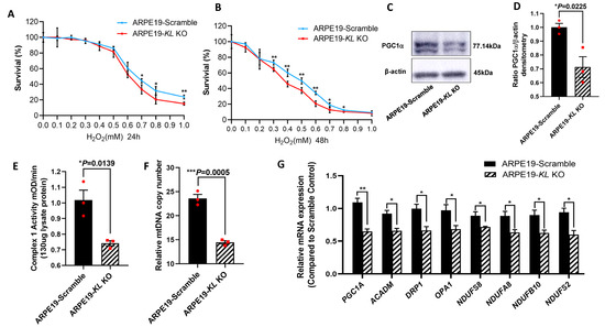 Inhibition of KL in human RPE reduces the cell viability and mitochondrial activity. ARPE19-CRISPR/Cas9-KL KO cells were treated with increasing concentrations of H2O2 for 24 h (A) or 48 h (B), followed by cell viability analyses. Cell viability was significantly higher in the control as compared to that of the ARPE19-KL KO cells at high concentration of H2O2 after 24 h of H2O2 treatment. Longer exposure to oxidative stress (48 h, H2O2) showed significant differences between the ARPE19-KL KO and control cells for 0.3–1 mM of H2O2. The mean ± SD and the p-values were calculated for statistical significance. Holm–Sidak t-test was performed using GraphPad Prism 8.3.0. * p ≤ 0.05, ** p ≤ 0.01. (C,D) PGC1 α protein levels were significantly lowered by inhibition of KL in ARPE19 cells for 4 weeks. (D) Densitometry analyses were performed by ImageJ software. (E) Mitochondrial complex1 activity was significantly reduced in the ARPE19-KL KO as compared to that in the scrambled control cells. (F) The mtDNA copy number was measured in the ARPE19-KL KO cells (n = 3) by qPCR, showing it was significantly reduced as compared to that of the control. (G) mRNA expression levels of mitochondrial activity-related genes, PGC-1α, ACADM, DRP1, OPA1, NDUFS2, NDUFS8, NDUFA8, and NDUFB10 were significantly decreased after inhibiting the KL in ARPE19 cells for 3 weeks. The unpaired t-test was performed using GraphPad Prism 8.3.0. Graph represents mean ± SEM, n = 3, * p ≤ 0.05, ** p ≤ 0.01, *** p ≤ 0.001.