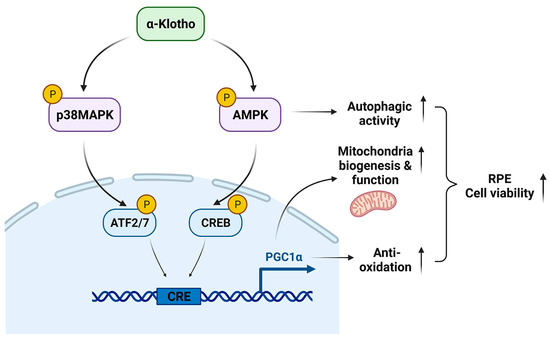KL phosphorylates and activates AMPK and p38MAPK, which in turn phosphorylate CREB and ATF2/7, respectively. Both CREB and ATF2 act on the same CRE site and induce the transcriptional activation of PGC-1α. Thus, KL promotes RPE cell viability by increasing mitochondrial biogenesis and functions as well as scavenging the ROS by activating the AMPK/PGC-1α pathway.