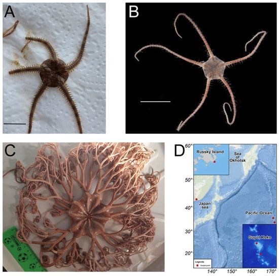 (A,B) Brittle stars Ophiura sarsii (A) and Ophiura ooplax (B). Scale bars: 1 cm. (C) Basket star Gorgonocephalus cf. eucnemis. (D) Map depicting the sample collection locations: Russky Island in the Japan sea for O. sarsii, Guyot Koko in the Pacific Ocean for O. ooplax, and G. cf. eucnemis.