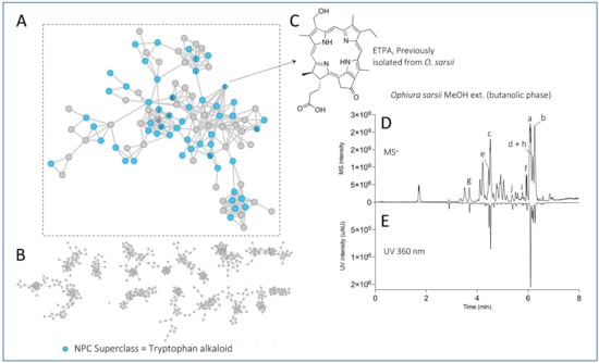 Feature-based Molecular Network of the EtOAc and MeOH (butanolic fraction) extracts of Ophiura sarsii. Nodes colored in blue belong to the “tryptophan alkaloid” predicted natural product superclass (NPClassifier). The previously isolated ETPA is displayed as a diamond. (A) The cluster containing chlorin ETPA and several related compounds. (B) Other major clusters of the Feature-Based Molecular Network. (C) Structure of the previously isolated ETPA. (D) UHPLC-MS profile of the MeOH extract (butanolic fraction) of O. sarsii with the 10 most intense ions of the chlorin cluster indicated with letters. (E) UHPLC-UV profile at 360 nm of the same extract. The same network mapped with the predicted natural product pathways is displayed in Supplementary Figure S33.
