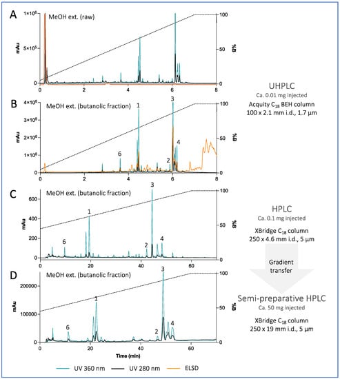 (A,B) UHPLC-PDA-ELSD analysis of the raw MeOH extract of Ophiura sarsii and its butanolic fraction. (C) Optimized HPLC-PDA-ELSD analysis of the MeOH extract (butanolic fraction) of O. sarsii. (D) semi-preparative HPLC-UV analysis after gradient transfer using a dry load injection. See Supplementary Figure S34 for the chromatograms of the EtOAc extract.