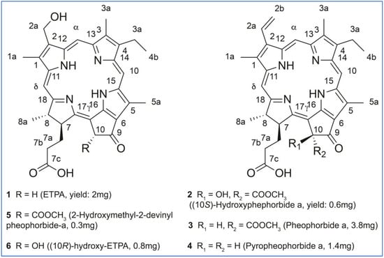 The elucidated structures of the chlorin compounds 1 to 6 from O. sarsii are shown in Figure 4. The Figure also provides the yields of these compounds, as isolated from EtOAc and/or MeOH extracts, starting from the dry mass of O. sarsii of 40 g. It can be seen that all six isolated chlorins are major metabolites, comparable in content to the ETPA we initially isolated from this brittle star.