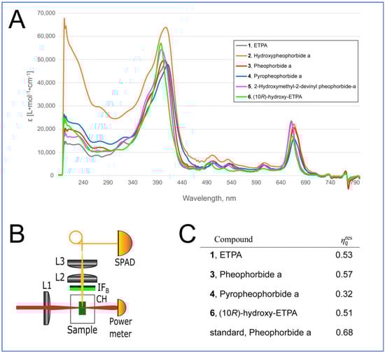 The isolated natural chlorin compounds show typical absorption and fluorescence spectra of chlorins such as the commercially available Pheophorbide a or the ETPA previously characterized by us [14,15] (Figure 5A and Supplementary Figures S35 and S36 for the UV–Vis, ECD, and fluorescence spectra). We next aimed at quantifying their relative singlet oxygen quantum yield using the device schematized in Figure 5B as described in Materials and Methods. Commercial Pheophorbide a was used as the standard.