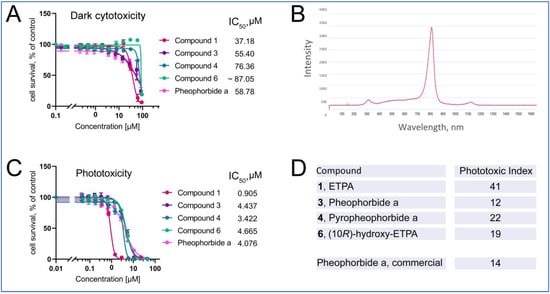 Photoactivation of the chlorins was achieved with an LED lamp, with the emission maximum partially covering the absorbance maximum of ca. 680 nm of chlorins (Figure 6B). Upon illumination with this lamp (see Materials and Methods for details), phototoxicity of the chlorin compounds was induced (Figure 6C) with the micomolar-to-submicromolar IC50s. Other isolates of compounds 1 and 3 give similar values (Supplementary Figure S37). The ratio of dark cytotoxicity IC50 to that of the phototoxicity gives the Phototoxic Index (PI)—the characteristic value of photosensitizers used in PDT. We find the PI values to vary from 12 to 41, being highest for ETPA among the tested compounds, in agreement with our previous findings [15].